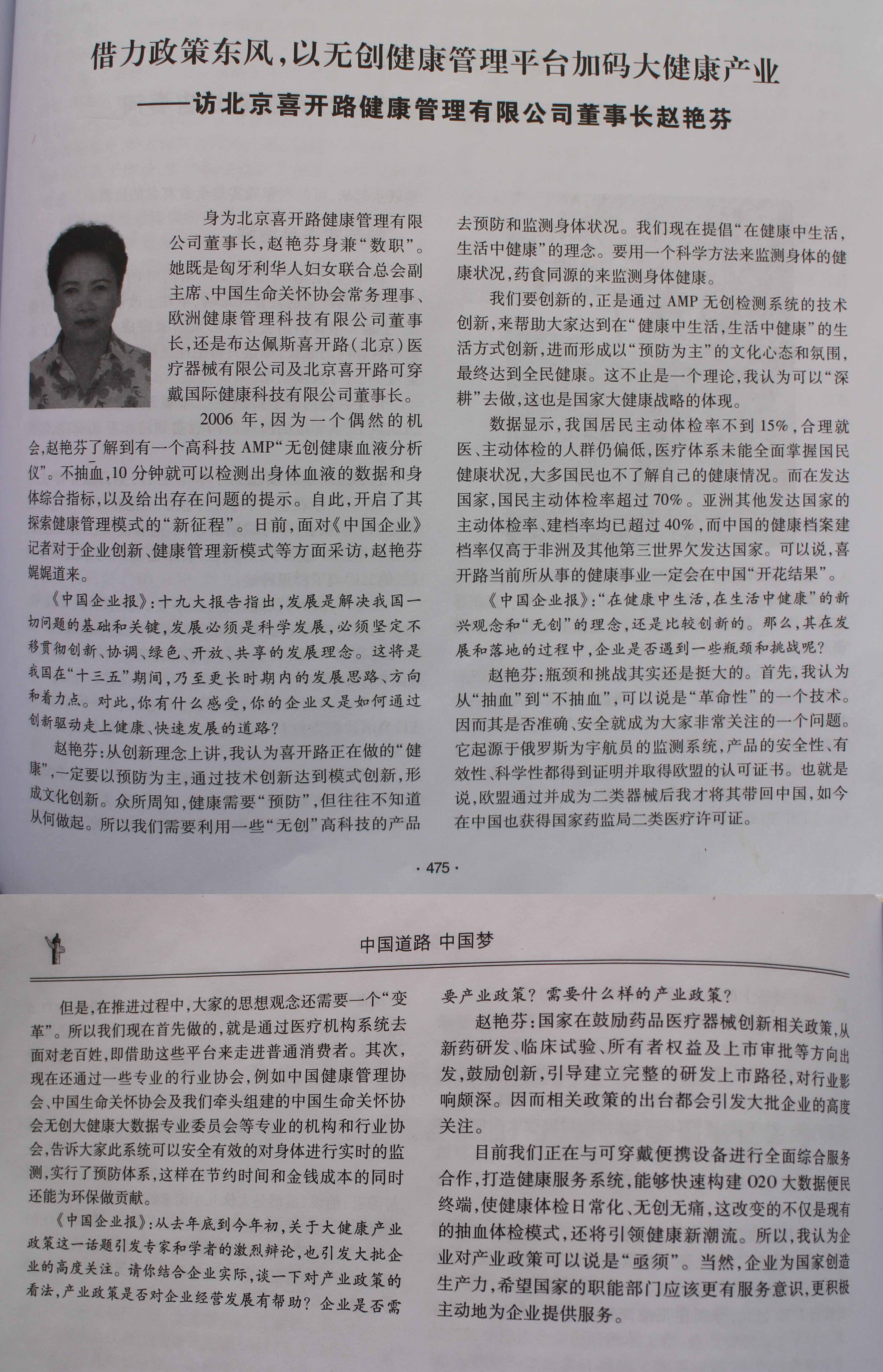 改革開放中國(guó)取得了巨大的發(fā)展和變化,趙艷芬女士帶領(lǐng)喜開路公司以引進(jìn)及合作無(wú)創(chuàng)健康技術(shù)和產(chǎn)品,構(gòu)建:無(wú)創(chuàng)數(shù)據(jù)化健康管理服務(wù)系統(tǒng),讓人們輕松的了解和管理自己的健康! 助力改善人們?cè)凇敖】抵猩?,生活中健康”的生活方式,形成以“預(yù)防為主”的文化氛圍,提高全民健康身體素質(zhì),正值改革開放40周年之際,趙艷芬女士被榮幸的入選《中國(guó)道路·中國(guó)夢(mèng)——紀(jì)念改革開放40周年》2018卷。我們將再接再厲,為收獲健康夢(mèng) ,實(shí)現(xiàn)中國(guó)夢(mèng)而更加努力奮斗。