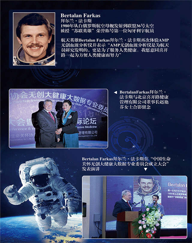她將世界唯一具有:無創(chuàng)國際醫(yī)學臨床數據表達的(血液),帶有自動大氣壓調節(jié)系統(tǒng)的(對高原人的客觀評價),無痛無創(chuàng)無感染,無耗材,10分鐘,不抽血知健康,低碳環(huán)保,智能化-數據化為航天員可以時時監(jiān)測身體指標而研制的無創(chuàng)檢測系統(tǒng)帶回中國,該系統(tǒng)已經具有中國國家藥監(jiān)局(CFDA)批準的醫(yī)療器械許可證,它將為我國數字化智能化的健康管理預防體系的建設,基層分級診療的篩查和鏈接,慢性病的監(jiān)管,亞健康的管理,老年人的康養(yǎng)等領域發(fā)揮它的重要作用,為此也受到國家相關領導單位的高度贊揚以及《中國政協》、《中國婦女》、《華商》、《中國企業(yè)家雜志》,《中華愛國豐碑》、中央電視臺《華人世界》欄目,人民日報海外版,中國新聞,新華網,人民網等媒體和雜志的宣傳報道,并被編入《中國百位杰出女民營企業(yè)家》和《中華愛國豐碑》書集里,2017年全國政協海外代表并提出“共建海內外華人健康管理預防體系”的提議,發(fā)起成立了:中國生命關懷協會無創(chuàng)大健康大數據專業(yè)委員會,被光榮入選2018卷《中國夢-健康夢-紀念改革開放40周年》里,她將帶領喜開路公司繼續(xù)為落實國家以“預防為主”的發(fā)展戰(zhàn)略貢獻我們最大的力量。